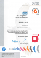 Sustav upravljanja tvrtke Geo Grupa d.o.o. je prosuđen, te se potvrđuje da zadovoljava norme ISO 9001:2015 i ISO 14001:2015 za slijedeći opseg aktivnosti: